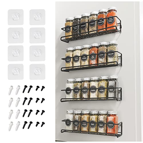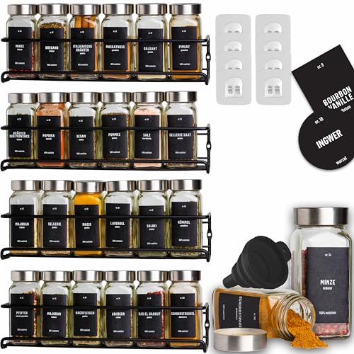 Deco haus® Kryddställ vägg Utan Borrning med 24 Kryddburkar & Etiketter - Kryddhylla hängande set om 4 - Kryddställ utan borrning svart - kryddförvaringshyllor organisatör - Kryddhylla skåpdörr