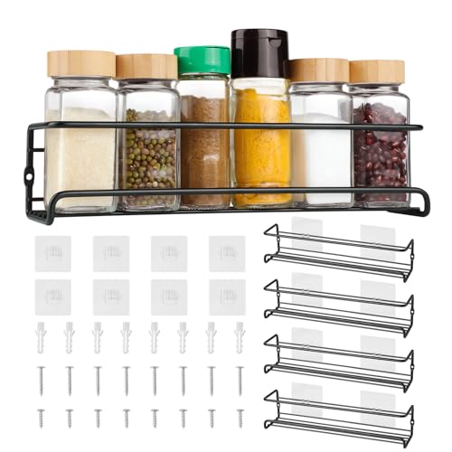 HDRNT Kryddhylla stående 4 set, kryddhylla vägg, kryddhållare hängande av metall, kryddförvaring för kryddburkar, köksskåp, skafferi, med 8 självhäftande och skruvar (29 x 6,5 x 7 cm)
