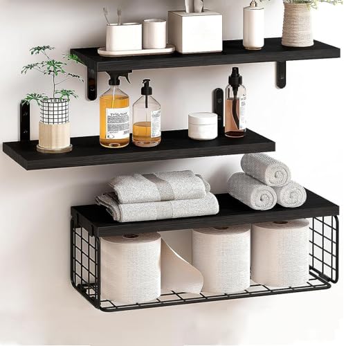 MUNGHOK Uppsättning av 3 40 cm, vägghylla, svart, hyllbräda, trä, svävande hylla med trådkorg, hylla, vägg, trä, väggbräda, kryddhylla, hängande hylla för badrum, sovrum, vardagsrum, kök