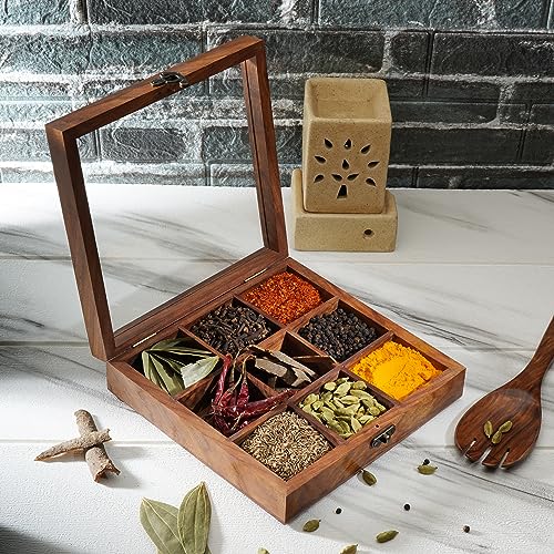 Ajuny Handgjord Masala Dabba indisk kryddlåda i trä med glaslock på ovansidan Sheesham rosenträ med 9 oavtagbara behållare och 1 sked masalaburk, kryddlåda