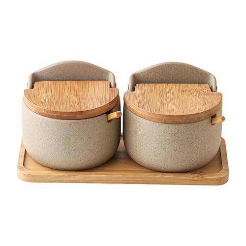 Keramiska kryddburkar, saltskål med lock, 2 x kryddburkar av keramik med sked och lock, kryddlåda, restaurang-hushållssalt och sockerburks-set, salthållare för motsocker-ingefärapulver