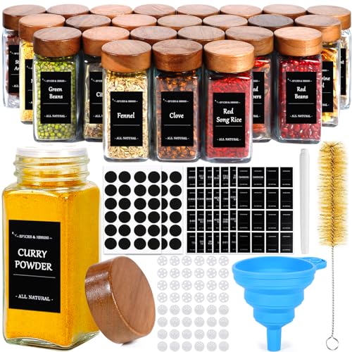 MOYKSRR Kryddburkset, kryddburkar fyrkantiga med trälock [24 x 120 ml] kryddströare, kryddburkar, glas, kryddburkar med 48 ströinsatser, etiketter, silikontratt, rengöringsborste
