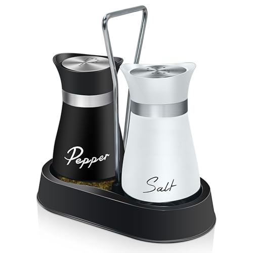 Country Salt- och Pepparkar Set med Hållare, Vintage Glas Svart och Vit Kryddströare, Rostfritt Stål Salt och Pepparkar, Lantlig Stil Köksdekoration för Hem Restaurang Bröllop BBQ Camping (Svart&Vit)
