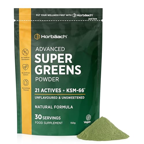 Super Greens Powder | 150 g | Veganskt Kosttillskott Pulver med Ashwagandha KSM-66 och 21 Aktiva Ingredienser - Chlorella, Spirulina, Vetegräspulver, Multivitamin och Mineraler med Mera! | av Horbaach