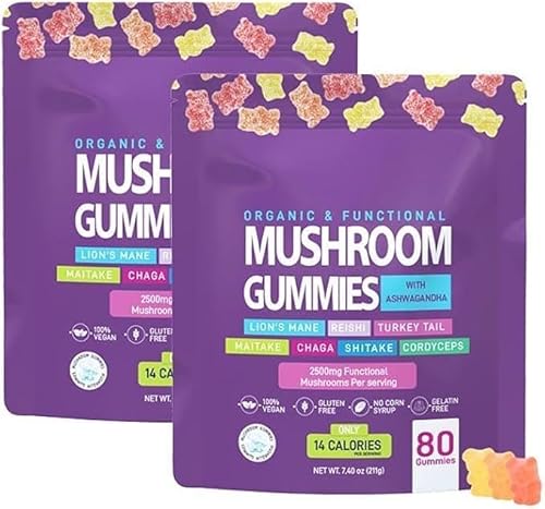 Mushroom Gummies, KSM 66 Ashwagandha & Lion's Mane Supplement Gummies, Styrka Och Kognitivt Stöd För Män Och Kvinnor,2pcs