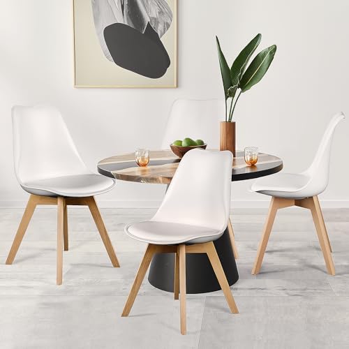 NEWBULIG Matrumsstolar set med 4 Mid-Century modern matsal vardagsrum sovrum utomhus lounge stol PU läder kuddar och träben, ash trä, vit, 4-pack