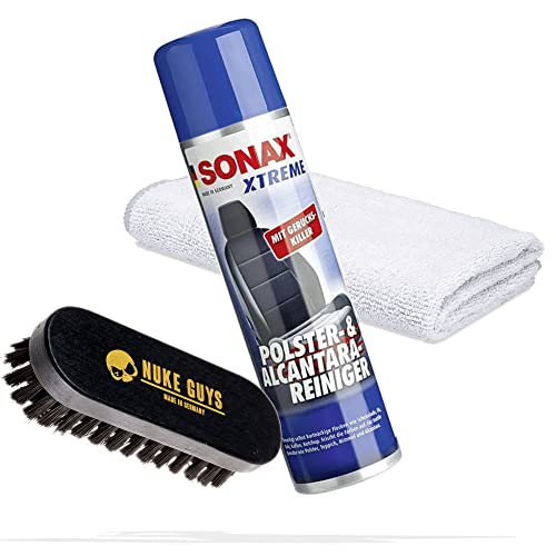 Detailmate Set för rengöring och vård av läder, kuddar och textilier | SONAX Xtreme klädselrengöringsmedel 0,4 l Nuke Guys borste S mikrofiberduk