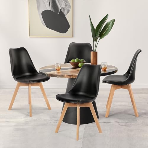 NEWBULIG Matrumsstolar set med 4 Mid-Century modern matsal vardagsrum sovrum utomhus lounge stol PU läder kuddar och träben, svart, 4-pack