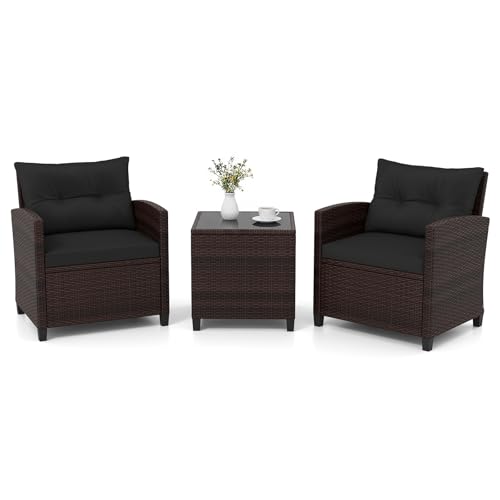 GIANTEX Trädgårdsmöbelset i rotting, 3 delar, 1 soffbord + 2 fåtöljer, vardagsrum, med kuddar för balkong, trädgård, gård, terrass, 3 färger (svart)