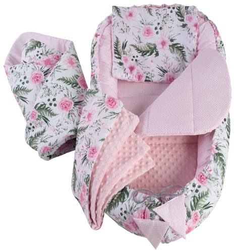 Medi Partners 5 st set med babybo 100 x 60 x 15 cm avtagbar insats platt kudde filt babyhorn för spädbarn nyfödda 100% bomull (blommor med ljusrosa plysch)