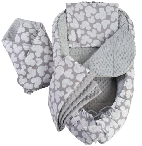 Medi Partners 5 st set med babybo 100 x 60 x 15 cm avtagbar insats platt kudde filt babyhorn för spädbarn nyfödda 100 procent bomull (Miki med grå minky)