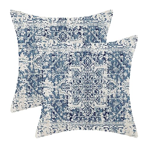 AEIOAE Kuddfodral i linne, set om 2, bohemiskt etniskt mönster, dekorativa, fyrkantiga kuddöverdrag, kuddöverdrag för soffa, säng, soffa, säng, blå, vit, 45 x 46 cm
