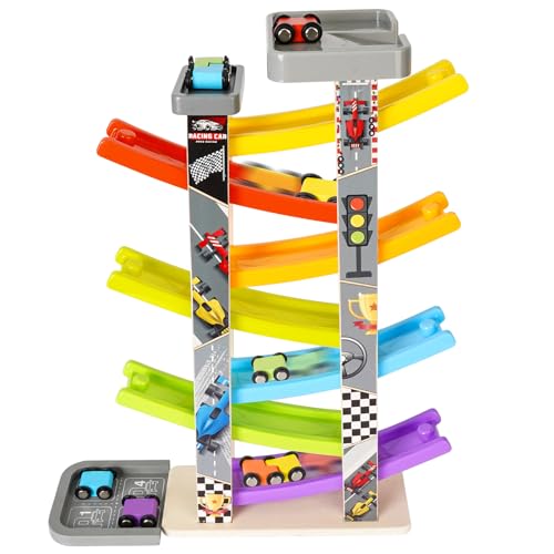 Bilbana träleksak, racerbana i kaskadstil av trä, med 7 racerbana och 7 fordon, leksak kulbana från 1 2 3 år, för pojkar flickor gåvor, födelsedagspresenter