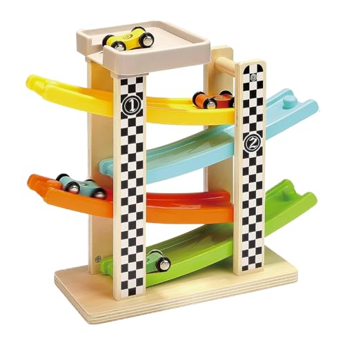 Kulbana bilar trä från 1 år, bil racerbana träleksaker, trä barnleksak 1 2 år pojkar med 4 minibilar och 2 parkeringsplatser