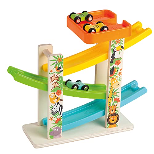 Kikuo Kulbana trä från 1 år, kulbana bil med 4 minibilar, utan BPA, kulbana av trä, bilbana träleksaker för en tvåårig billeksak
