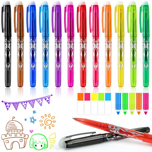 MINISOISO 12 stycken raderbara pennor, 0,7 mm färgraderbar gelpenna, raderbar penna med sidtaggar, raderbara kulspetspennor för grundskola, kontor, familj
