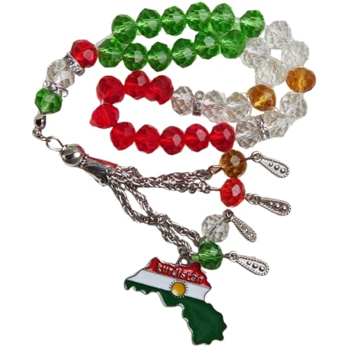Tsffae radband armband muslimska 33 pärlor bön armband med kurdistan karta flagga hänge etnisk stil bön religiös smycken gåva, 20cm/7.87in, Kristall