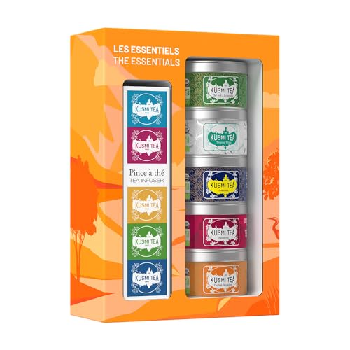 Kusmi Tea - ”The Essentials” Presentförpackning + Tea Tong - Ekologiskt tesortiment - Presentidé för män och kvinnor - Svart te, grönt te och infusioner - Tillverkad i Frankrike - 5 askar à 25g