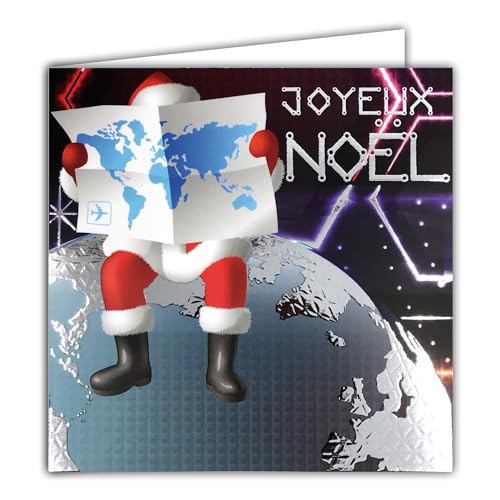 Lysande silver jultomte fyrkantigt kort med vitt kuvert 15 x 15 cm - World Planisphere Globe Planet Earth Travel Galaxy Stars Night 25 December helgdagar slutet av året - tillverkad i Frankrike