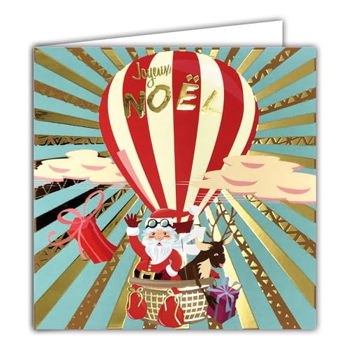 Merry Santa Claus Square Card i glänsande guld med vitt kuvert 15 x 15 cm - ren ballong leverans gåvor som fallit från himlen öppen spis 25 december helgdagar slutet av vintern - tillverkad i