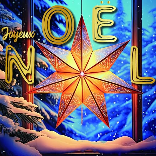 23089 God jul guld glänsande fyrkantigt kort med vitt fyrkantigt kuvert storlek 15 x 15 cm - upplyst lysande stjärna hängande framför ett fönster under snön - vit interiör - tillverkad i Frankrike