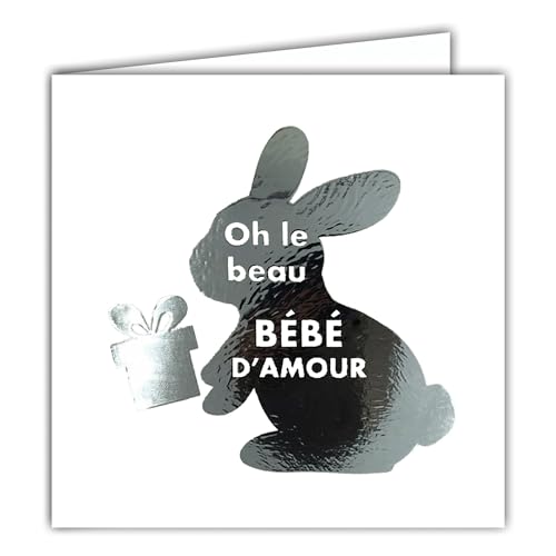 22243 Fyrkantigt kort gratulationer Oh the Beautiful Baby of Love Välkommen födelse eller adoption barn liten kanin silver glänsande som håller en gåva - med vitt kuvert 15 x 15 cm - gör i Frankrike