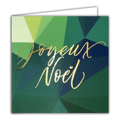 God jul fyrkantigt kort i glänsande guldguld med vitt kuvert 15 x 15 cm - blågrön triangulär geometrisk gran abstrakt fasetterad 25 december helgdagar slutet av året - tillverkad i Frankrike
