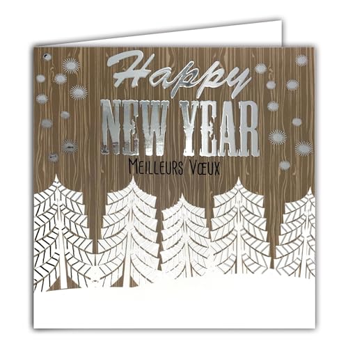 Happy New Year fyrkantiga hälsningar silver bästa hälsningar med vitt kuvert 15 x 15 cm - julgran snöflinnande trä vinter - tillverkad i Frankrike