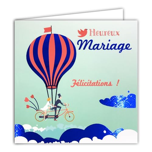 Grattis på lyckligt bröllop blått glänsande vitt interiör med vitt fyrkantigt kuvert 15 x 15 cm tillverkat i Frankrike par på en tandemcykel varmluftsballong fågel vara på ett litet moln 22116