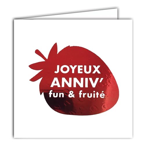 22208 Rolig och fruktig glad födelsedag fyrkantigt kort på en lysande röd jordgubbe med vitt kuvert 15 x 15 cm - fransk tillverkad tryckutgåva - dröm ordkollektion