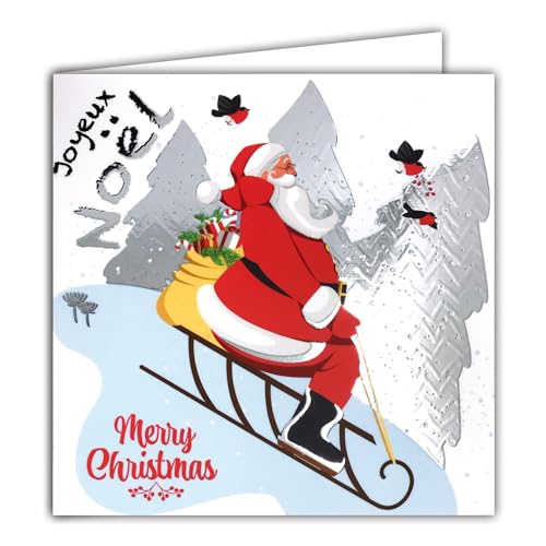 Lysande silver jultomte fyrkantigt kort med vitt kuvert 15 x 15 cm - släde huva leverans skogspresenter granar fåglar rödhals 25 december fester slutet av vintern - tillverkad i Frankrike