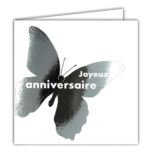 22212 Glad födelsedag fyrkantigt kort på en glänsande silver fjäril med vitt kuvert 15 x 15 cm - vit interiör - fransk tryckt skapelse - dröm ordkollektion