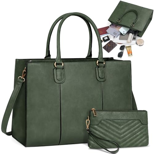 NEWHEY Laptopväska för kvinnor, 40 cm stor arbetsväska med kuvertväska, axelväska i PU-läder, designerhandväska med laptopficka för skola, kontor, resa, affärer, gRÖN