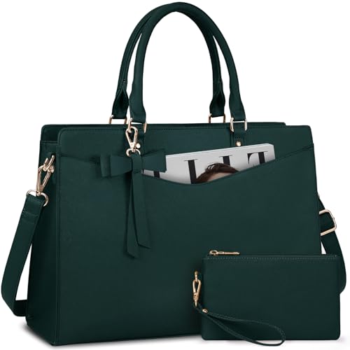 RAINSMORE Laptopväskor för kvinnor 15,6 tum stor bärbar dator tygväska PU-läder dam laptop handväska med kuvertväska vattentålig arbetsväskor för affärer kontor skola ledig, Mörkgrön, M, Klassisk