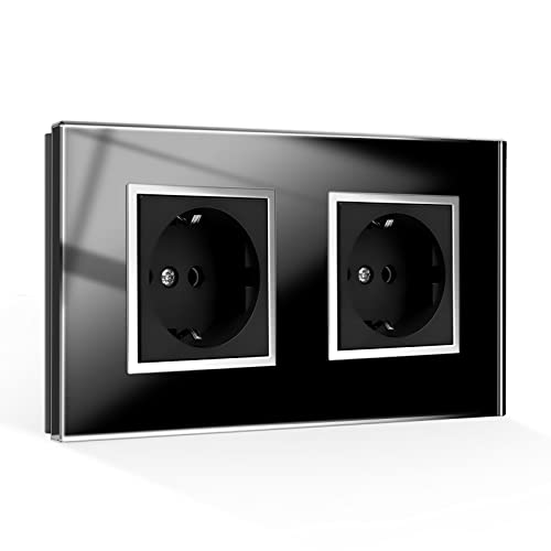 CNBINGO Glas Schuko-uttag dubbelt – design skyddskontakt vägguttag med glasram – dubbeluttag infälld i svart – med monteringsmaterial – design inre ram kvadratisk