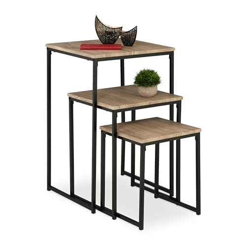 Relaxdays Sidobord set om 3, stapelbar, bordsset 3 storlekar, kvadratiskt, metall, vardagsrum, dekorativt bord, grå/svart, fiberskiva, 76 x 46 x 46 cm