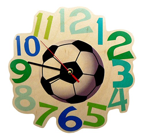 Hess Träleksak 30 000 – väggklocka av trä för barn, serie fotboll, med kvartsurverk, handgjord, diameter ca 21 cm, färgglad tidsvisning för barnens rum