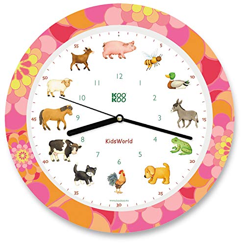 KOOKOO KidsWorld Sunny Flower, bondgårdsklocka med 12 riktiga djurröster från landet, kvartsurverk, flerfärgad, 34 cm