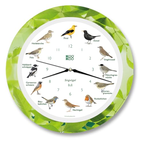 KOOKOO sångfåglar kvartsurverk blad, den sungande fågelklockan, rund väggklocka med naturliga fågelröster