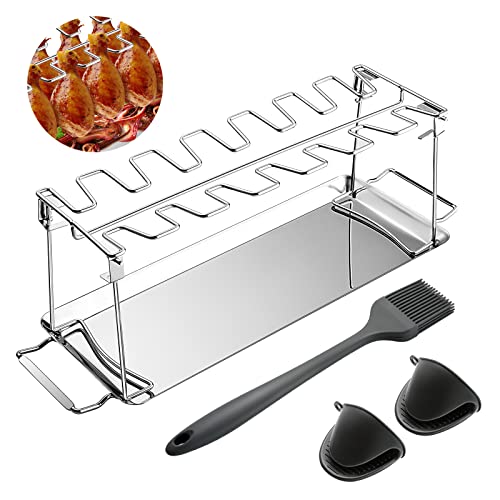 Vorsee Kycklinglårhållare, rostfritt stål kycklinghållare för 14 kycklingskålar med BBQ pensel grytlappshandskar grilltillbehör perfekt grillade kycklingvingar vikbara, silver