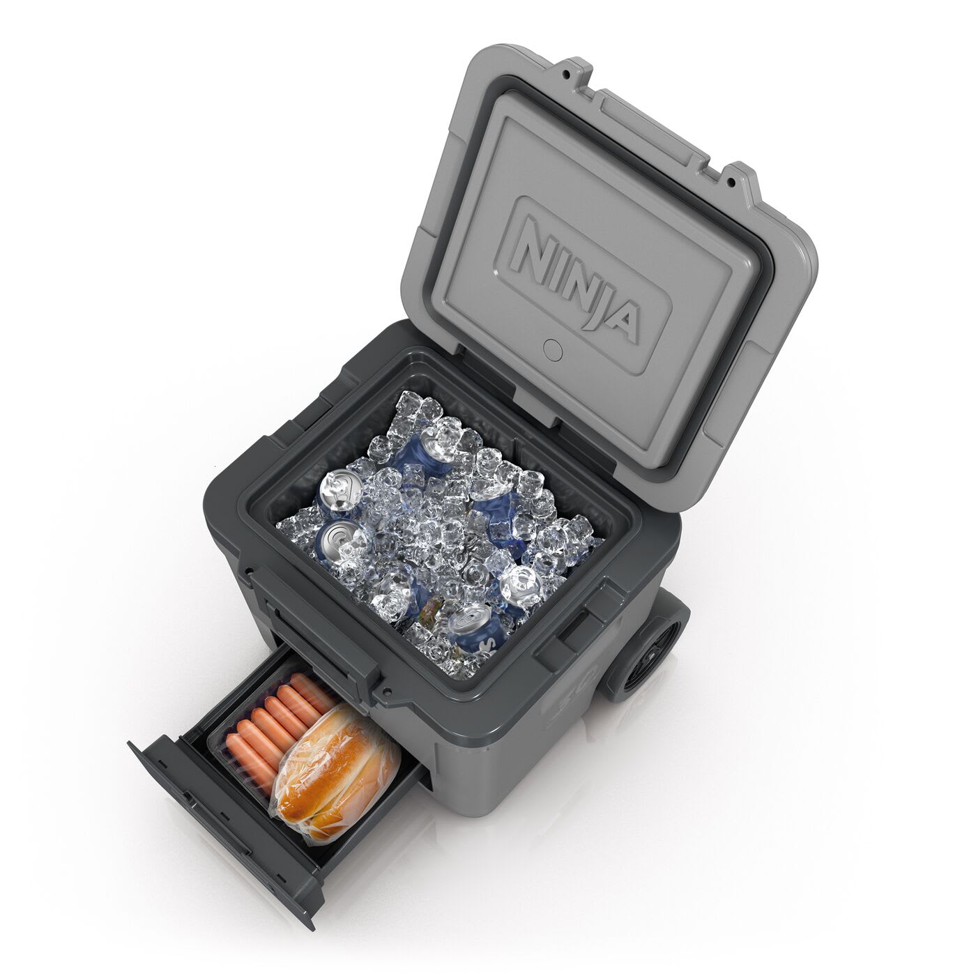 Ninja FrostVault kraftig isolerad kylbox, premiumkylbox m/hjul, integrerad Dry Zone-låda för torrförvaring i kylskåpstemperatur, håller is i flera dagar, rymmer upp till 97 burkar, grå, FB265EUGY