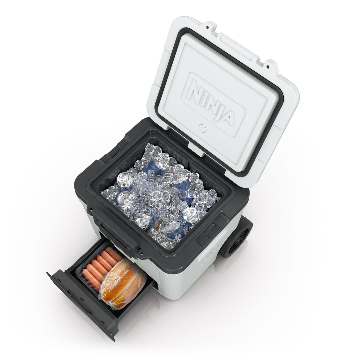 Ninja FrostVault kraftig isolerad kylbox, premiumkylbox m/hjul, integrerad Dry Zone-låda för torrförvaring i kylskåpstemperatur, håller is i flera dagar, rymmer upp till 48 burkar, molnvit, FB230EUWH