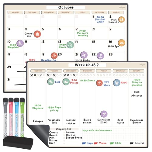 Milijou Magnetisk kalender för kylskåp i A3-storlek – månads- och veckoplanerare – 42 evenemangsklistermärken, 4 markörer, 1 gummi – magnetisk whiteboard – wellness tracker