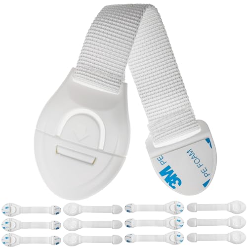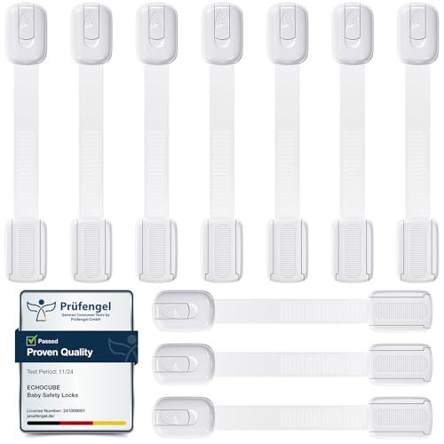 ECHOCUBE Lås för barnsäkerhetsskåp(10-pack), Justerbara babysäkra skåplås med 3M-lim, Babysäkerhetslås för flera skåp, Lådor, Kylskåp, Toalett, Skräp behövs ingen borrning (Vit)