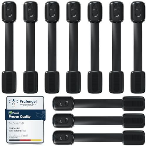 ECHOCUBE Lås för barnsäkerhetsskåp(10-pack), Justerbara babysäkra skåplås med 3M-lim, Babysäkerhetslås för flera olika skåp, lådor, Kylskåp, Toalett, Skräp behövs ingen borrning (svart)