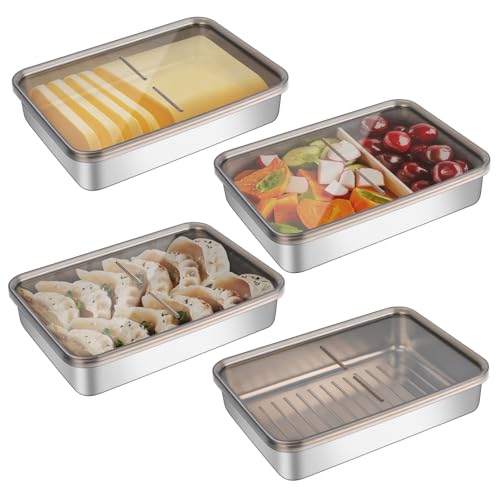 Kongming 4 stycken rostfria tillskurna lådor för kylskåp korv förvaring förvaringsburkar med lock lufttät skärlåda för förvaring av ost, kött, korv, frukt
