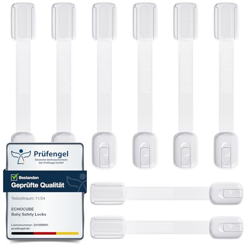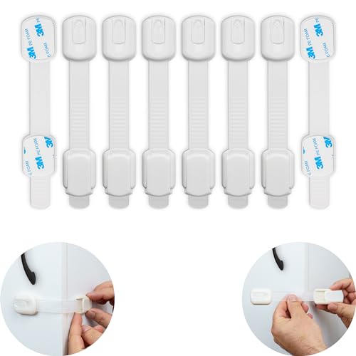 ECHOCUBE Lås för barnsäkerhetsskåp(8-pack), Justerbara babysäkra skåplås med 3M-lim, Babysäkerhetslås för flera skåp, Lådor, Kylskåp, Toalett, Skräp behövs ingen borrning (Vit)
