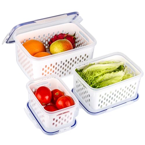 Belle Vous 3-pack kylskåpsförvaring för frukt och grönt med durkslag - återanvändbara förvaringsbehållare med lock i plast för kyl/frys - för grönsaker och frukt - diskmaskin-/mikrovågssäkra