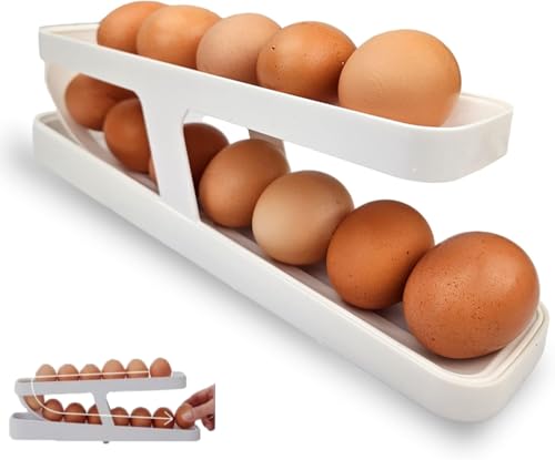 GEFIRE Ägghållare kylskåp, äggbehållare för kylskåp, kylskåpsförvaring, äggrullställ med 2 nivåer ägghållare för kylskåpet, automatisk ägghylla för kylskåp rymmer 13-14 standardägg
