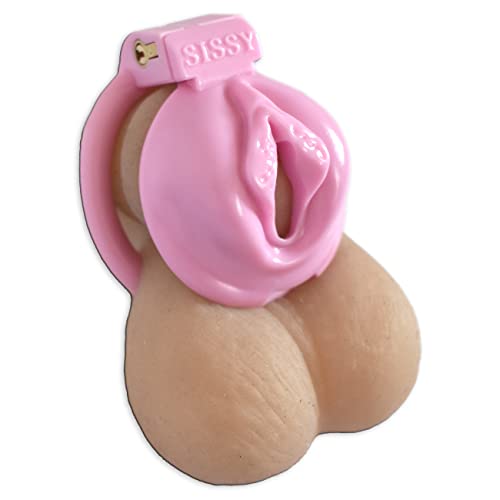 Frivol rosa sissy penisbur + 4 kukringar med blygdläppar - fetish pussy plast kyskhetsbur - BDSM bondage kyskhetsbälte (storlek L - skalets längd = 4,00 cm)